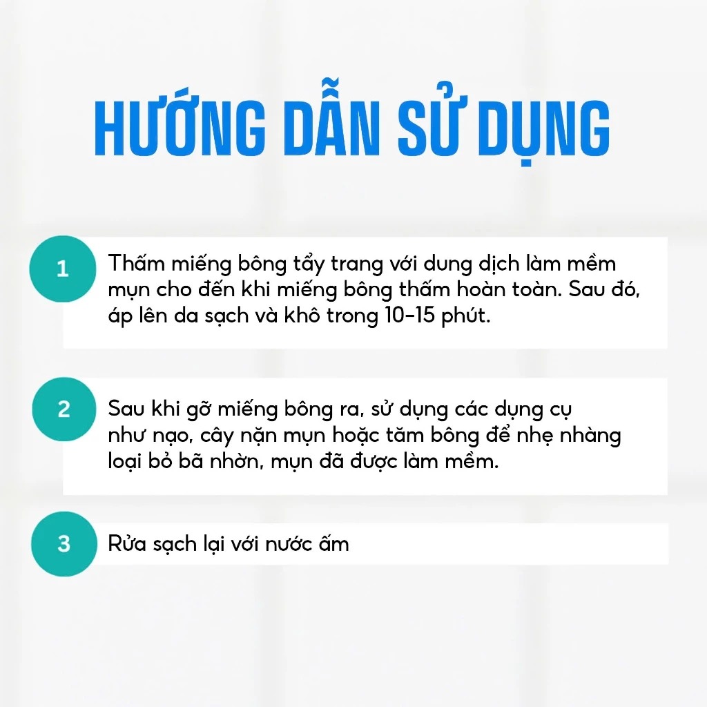 Bước 1: Thấm miếng bông tẩy trang với dung dịch làm mềm mụn cho đến khi miếng bông thấm hoàn toàn. Sau đó, áp lên da sạch và khô trong 10-15 phút.