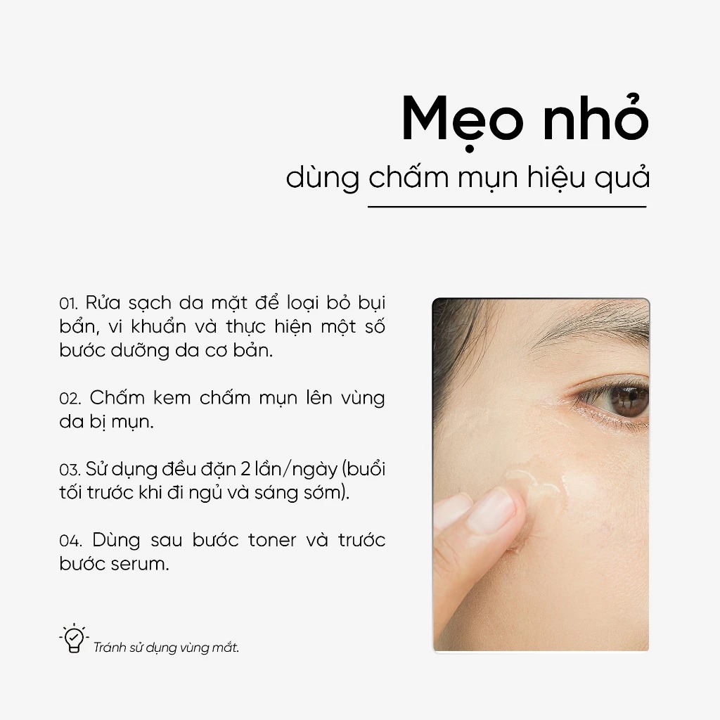 Sử dụng chấm trực tiếp lên vùng mụn sau khi rửa mặt sạch. Dùng hàng ngày vào buổi sáng và tối để đạt hiệu quả tốt nhất. Kết hợp cùng kem dưỡng ẩm và chống nắng để bảo vệ làn da.