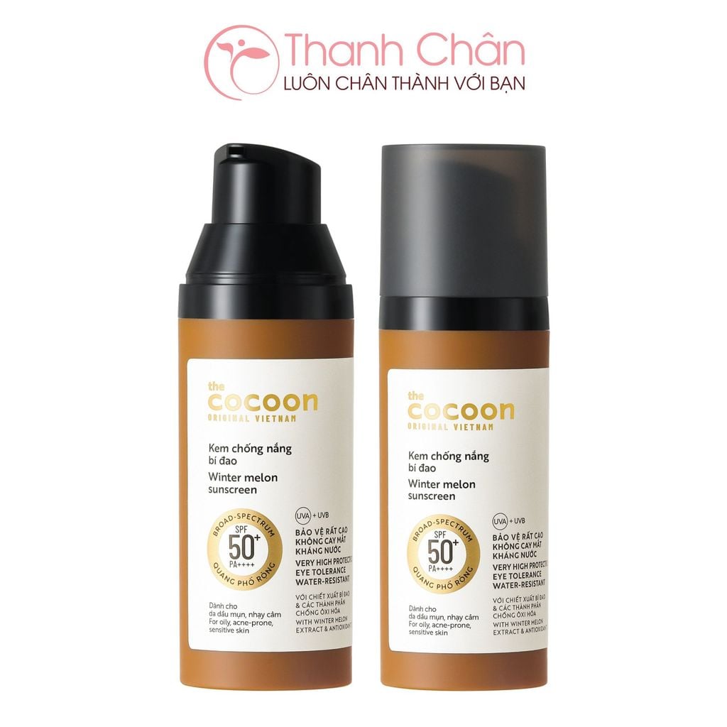 Kem Chống Nắng Bí Đao Quang Phổ Rộng Dành Cho Da Dầu, Nhạy Cảm Cocoon Winter Melon Sunscreen là kem chống nắng thuộc thương hiệu mỹ phẩm thuần chay Cocoon đến từ Việt Nam. Sản phẩm nổi bật với công thức đột phá kết hợp các màng lọc thế hệ mới cùng chiết xuất bí đao và các thành phần chống oxy hóa giúp tăng khả năng chống nắng, bảo vệ da hiệu quả trước các tác nhân gây hại cho da như tia UV, khói bụi,.... Đồng thời sản phẩm giúp giảm bóng dầu, không gây bí da hay nhờn rít nên phù hợp với da dầu, nhạy cảm.