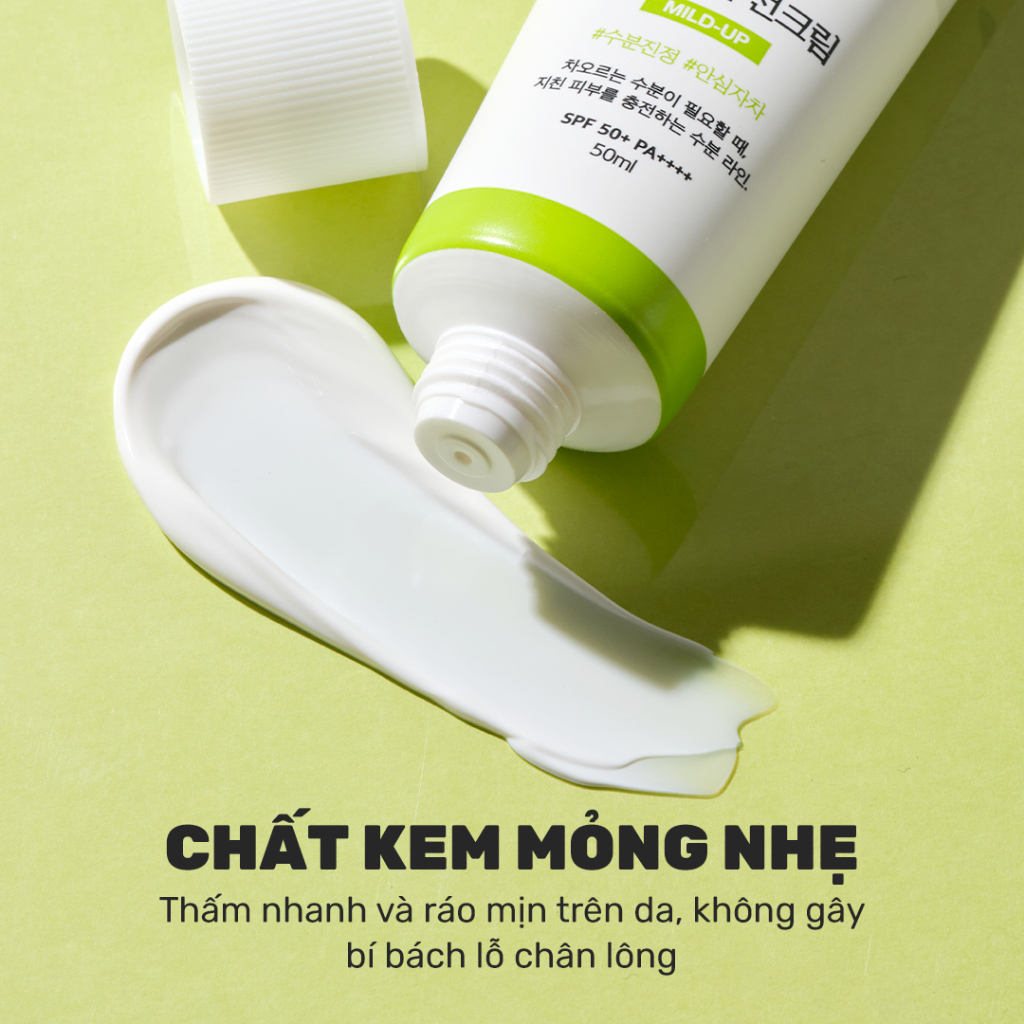 - Kem chống nắng vật lý với màng lọc Zinc Oxide (phi nano) đạt hiệu quả chống nắng SPF50+, PA++++