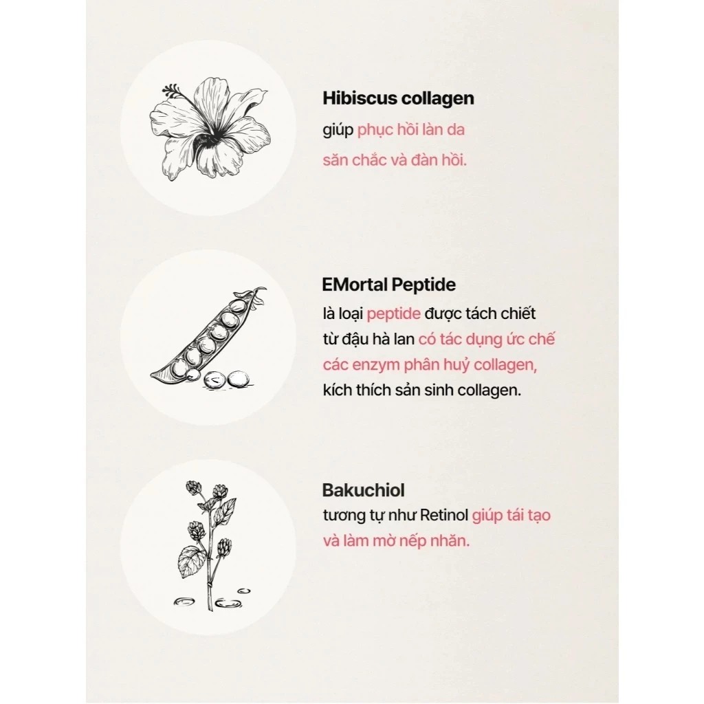Với thành phần được cấp bằng sáng chế Phyto Collagen và chứa 29 loại thành phần có nguồn gốc từ thực vật giúp chống oxy hóa , ngăn ngừa các dấu hiệu lão hóa. Bakuchiol tương tự như retinol giúp tái tạo và làm mờ nếp nhăn lên đến 10.86% sau 2 tuần sử dụng. Đặc biệt , kết hợp cùng EMortal Peptide là loại peptide được tách chiết từ đậu hà lan có tác dụng kích thích sản sinh collagen mang lại làn da đàn hồi và căng bóng.