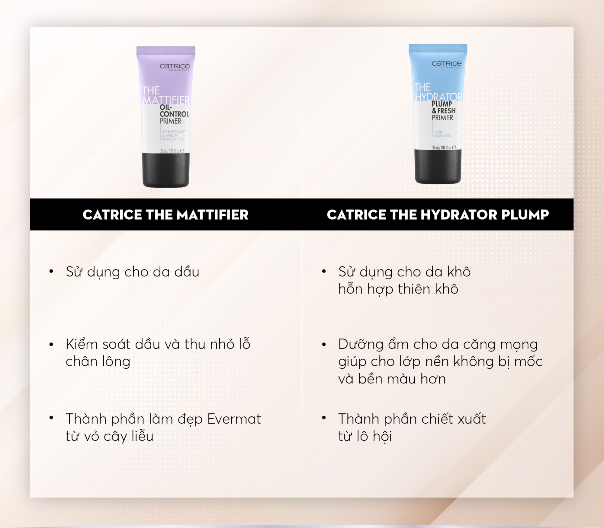 - Catrice The Mattifier Oil-Control Primer (Tím): giúp kiềm dầu và se khít lỗ chân lông, từ đó giảm thiểu độ bóng nhờn trên da một cách hiệu quả.