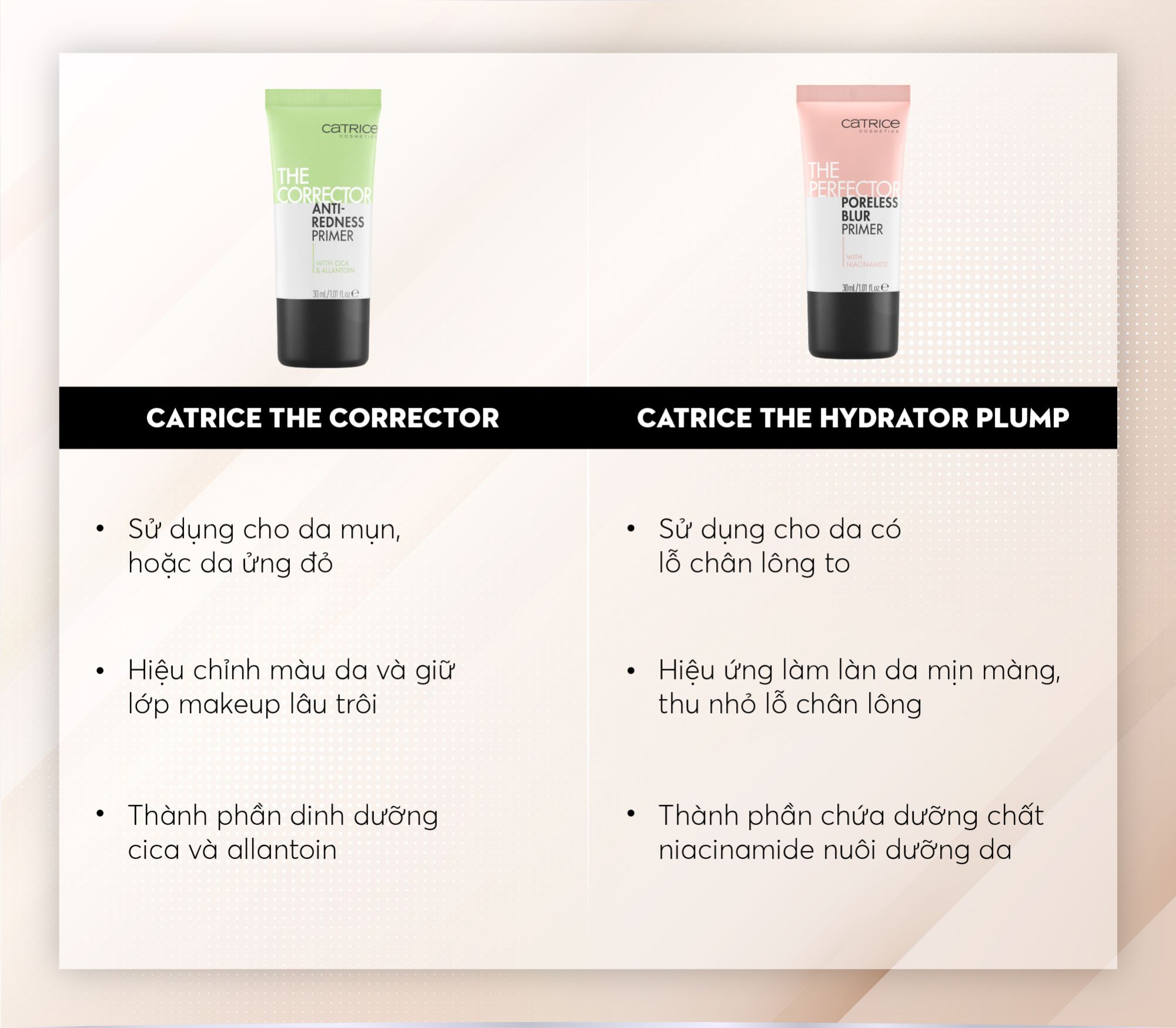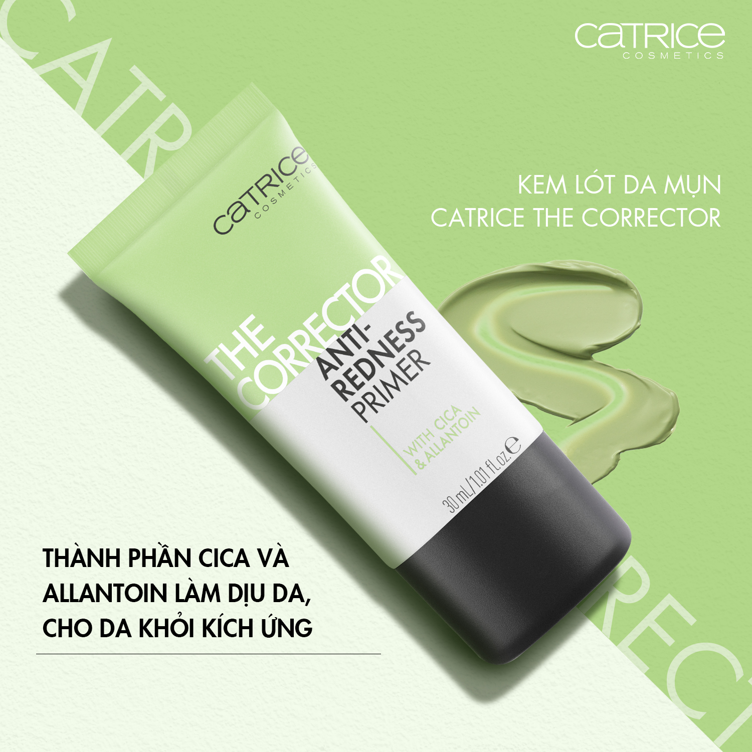 - Catrice The Corrector Anti-Redness Primer (Xanh lá): Kem lót cho da mụn, với công thức làm dịu và cấp ẩm tức thì, sản phẩm này giúp cho da trở nên căng mượt và loại bỏ hoàn toàn nỗi sợ về tình trạng "mốc nền"