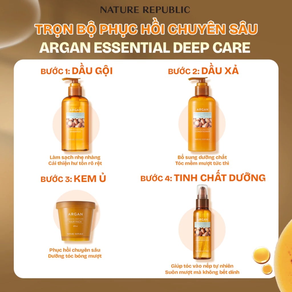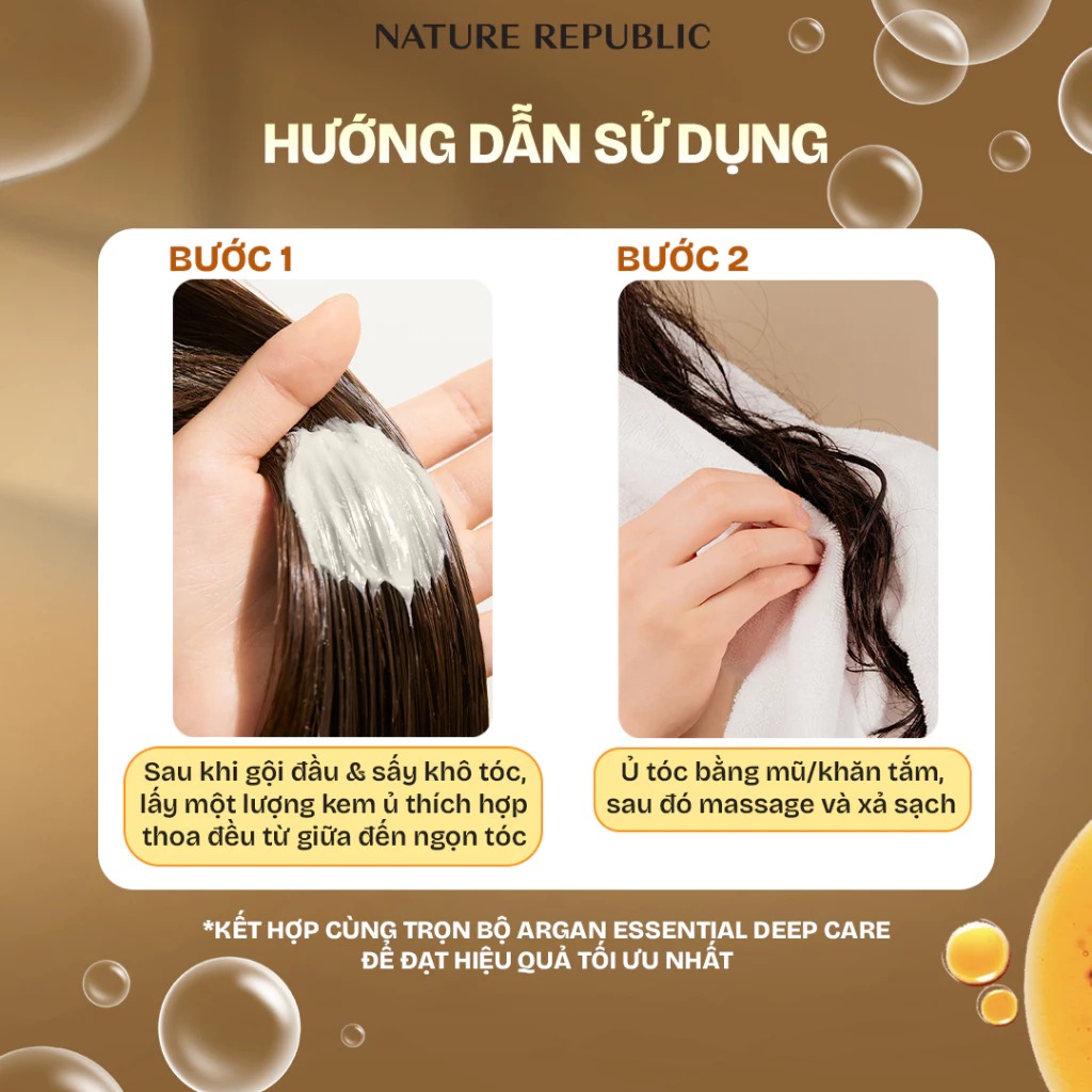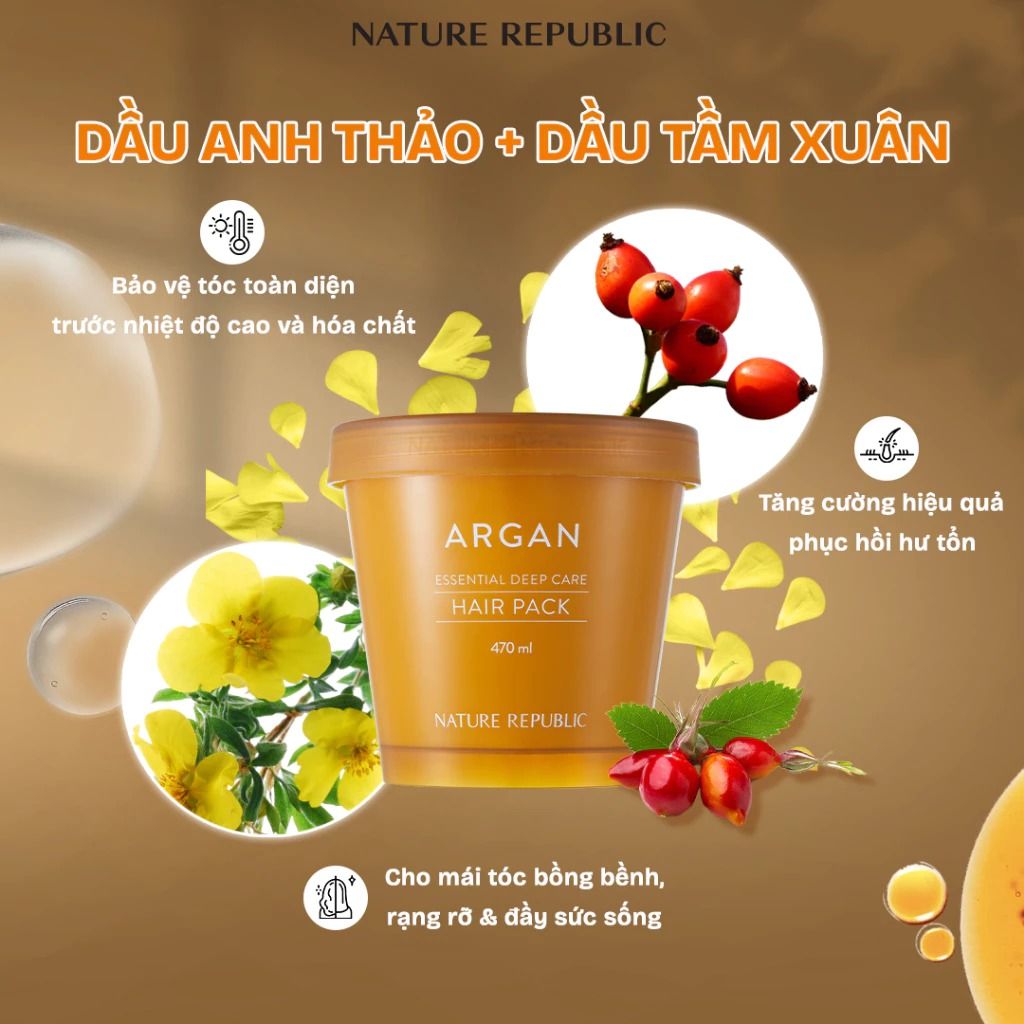 Kem ủ phục hồi tóc bóng mượt chuyên sâu (Argan Essential Deep Care Hair Pack) là sản phẩm phục hồi mái tóc chuyên sâu khi gặp các vấn đề hư tổn nặng do uốn, duỗi, nhuộm liên tục, hoặc các mái tóc gặp tình trạng khô, xơ, rối, kém bồng bềnh, óng mượt, … nhờ việc tận dụng loại dầu Argan quý hiếm từ Ma Rốc chứa hàm lượng Vitamin E cực cao (gấp 4 lần so với dầu Oliu), kết hợp với các loại dầu thực vật (anh thảo, tầm xuân), biotin & phức hợp 3 loại protein thuỷ phân từ thực vật mang lại hiệu quả dưỡng ẩm, bổ sung dưỡng chất & chăm sóc tóc hiệu quả.