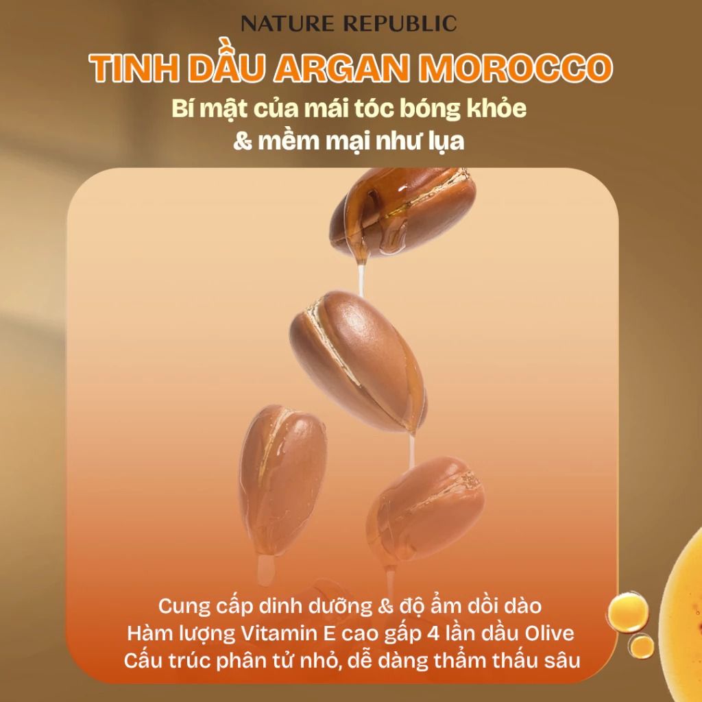 - Dầu Argan (Ma Rốc): chứa hàm lượng cao vitamin E giúp dưỡng ẩm sâu cho tóc để giảm các vấn đề khô, xơ, rối, cũng như phục hồi sâu cho tóc nhờ kết cấu mỏng nhẹ & cấu trúc phân tử nhỏ có thể dễ dàng thẩm thấu vào tóc và mang lại hiệu quả chăm sóc tóc bóng mượt, bồng bềnh. Ngoài ra, thành phần này còn giúp làm giảm rụng tóc, hỗ trợ kích thích mọc tóc, cũng như bảo vệ tóc trước các phương pháp làm đẹp như uốn, duỗi, nhuộm, …