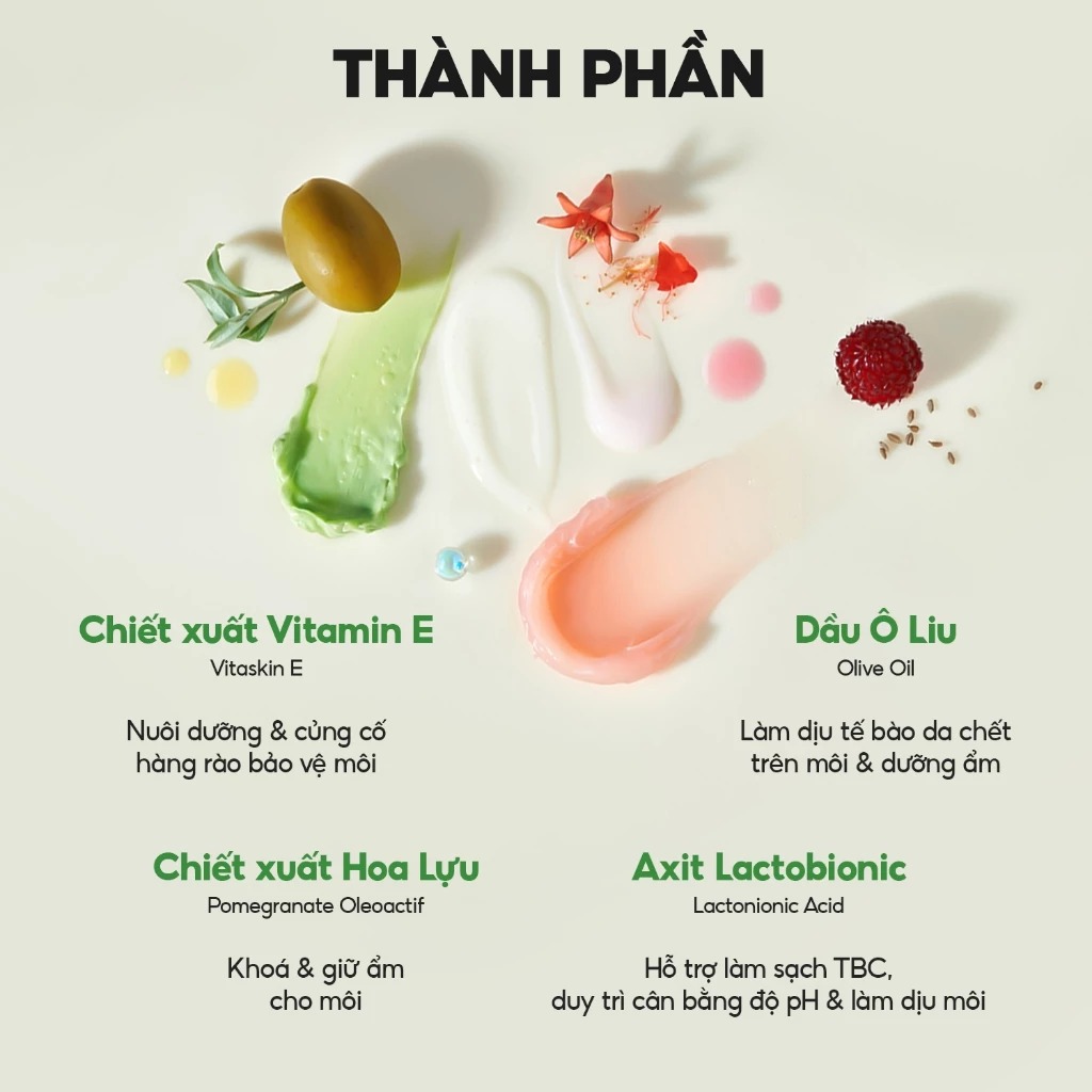 Chứa Vitamin E analog và các chất chống oxy hóa, hỗ trợ loại bỏ tế bào chết.