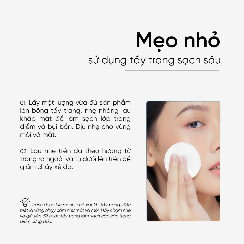 ● Thấm một lượng vừa đủ nước tẩy trang lên bông mềm, nhẹ nhàng lau khắp mặt để làm sạch.