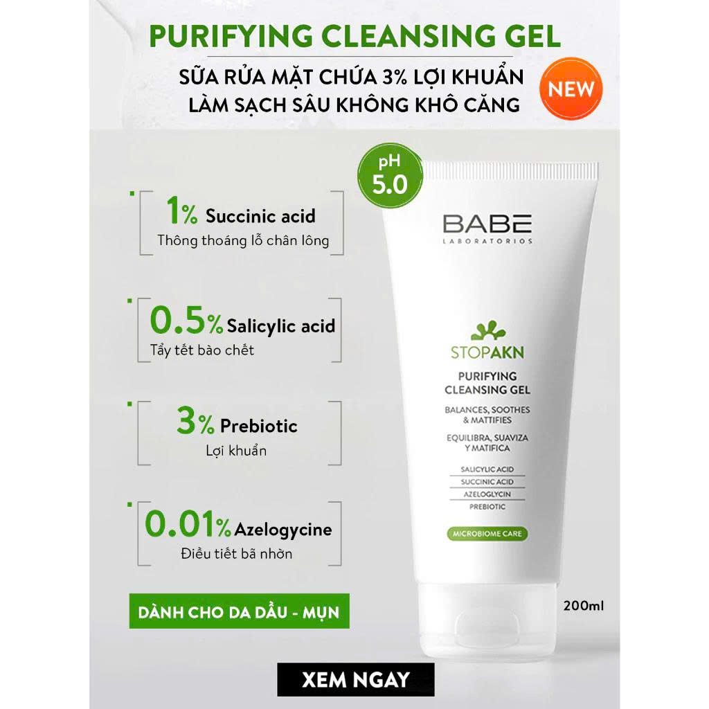 Sữa rửa mặt BABE Stop Akn Purifying Cleansing gel cho da dầu mụn 200ml