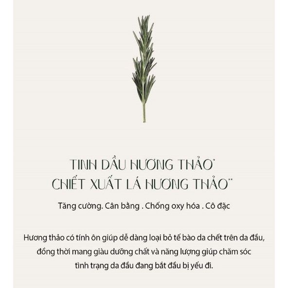 + Hương thảo có chất chống oxy hóa giúp giảm thiểu rụng tóc và kích thích mọc tóc mới, giúp tóc mềm mượt, dễ chải và giảm thiểu khô và xơ tóc, có khả năng làm sạch da đầu và ngăn ngừa sự hình thành của gàu