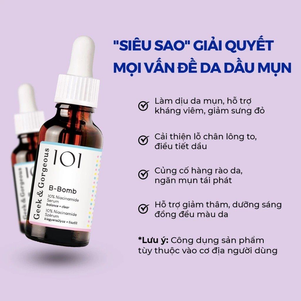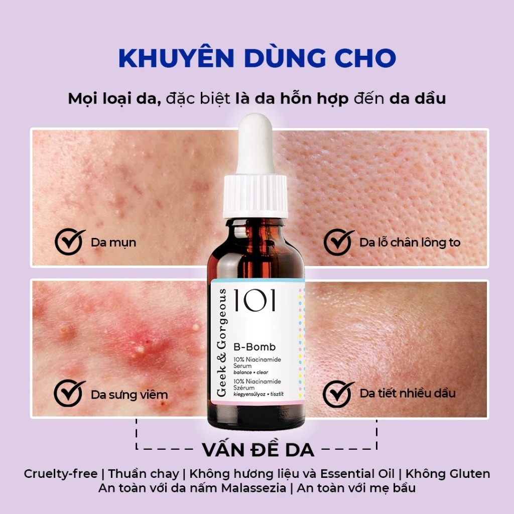 - Niacinamide 10%: Làm sáng da, giảm thâm mụn, cải thiện lỗ chân lông và hàng rào bảo vệ da.