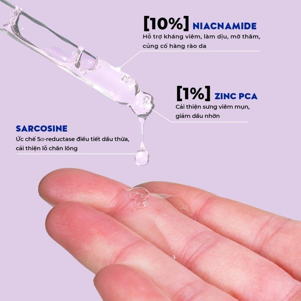 - Zinc PCA: Kiểm soát dầu thừa, hỗ trợ giảm mụn mà không gây khô da.