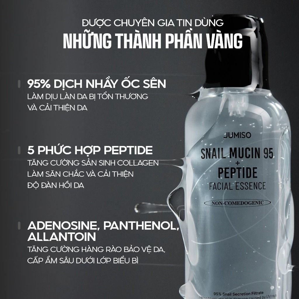 Tinh chất JUMISO Snail Mucin 95 + Peptide là sản phẩm chăm sóc da chuyên sâu với kết cấu mỏng nhẹ, thấm nhanh, phù hợp sử dụng hằng ngày. Công thức chứa hàm lượng cao dịch nhầy ốc sên kết hợp peptide giúp làn da trông ẩm mượt, đàn hồi hơn và khỏe khoắn theo thời gian. Sản phẩm mang lại cảm giác thông thoáng khi sử dụng, không gây nặng da hay bí da.