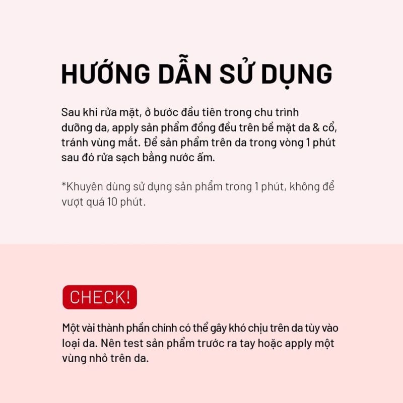 Lưu ý: Một vài thành phần chính có thể gây khó chịu trên da tùy vào loại da. Nên test sản phẩm trước ra tay hoặc apply 1 vùng nhỏ trên da.