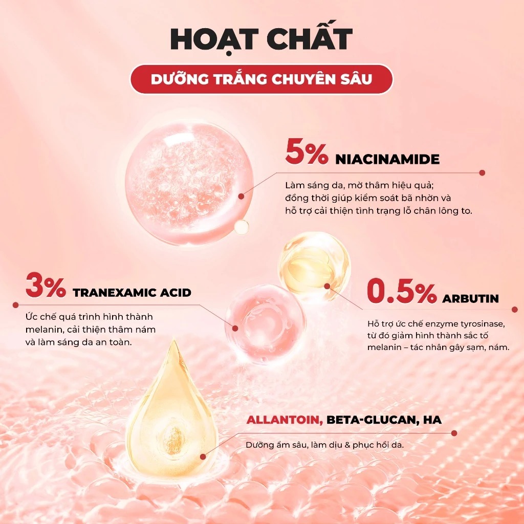 Giải pháp dưỡng sáng da thế hệ mới dành riêng cho da dầu mụn & da thâm sau mụn – với bộ ba hoạt chất “vàng” Niacinamide 5% + Tranexamic Acid 3% + Arbutin 0.5%, giúp: