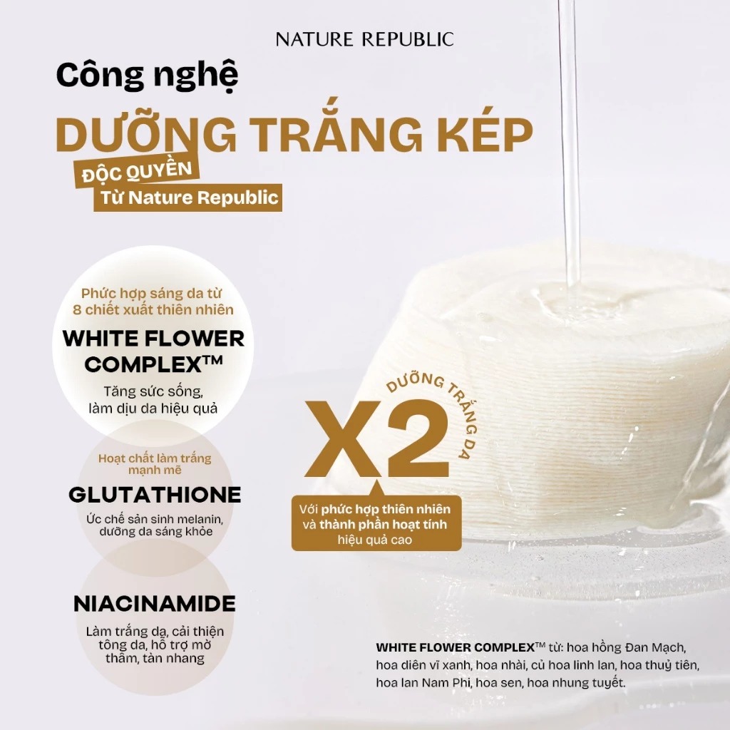 - Phức hợp chiết xuất từ 8 loài hoa trắng quý hiếm: Nấm Thượng Hoàng, đỗ xanh, mầm lúa mì, hoa nhài, hoa hồng Damask,...