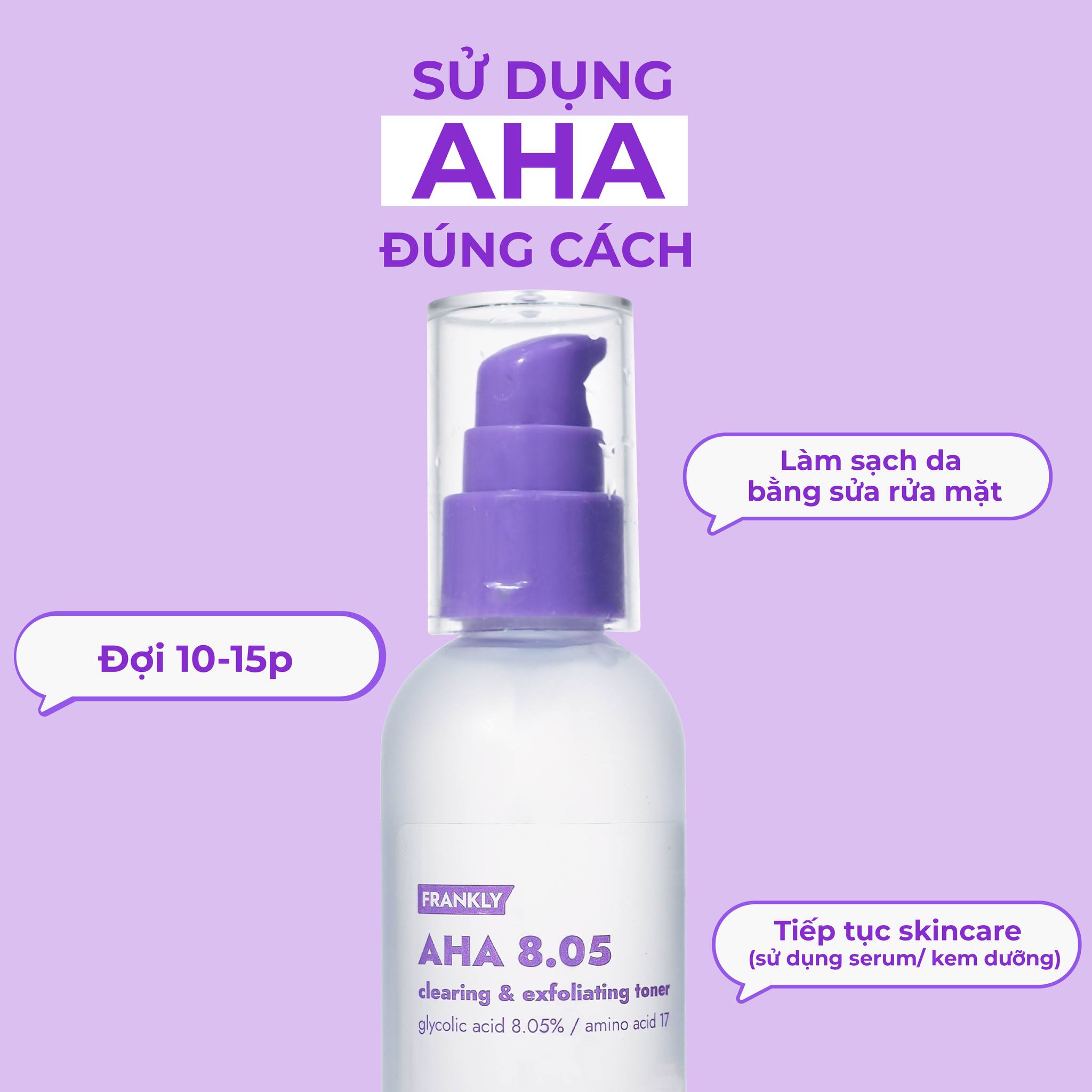 -Nếu sử dụng các hoạt chất khác (vitamin C và retinol), chúng tôi khuyên bạn nên sử dụng xen kẽ với Frankly AHA 8.05 Clearing & Exfoliating Toner.