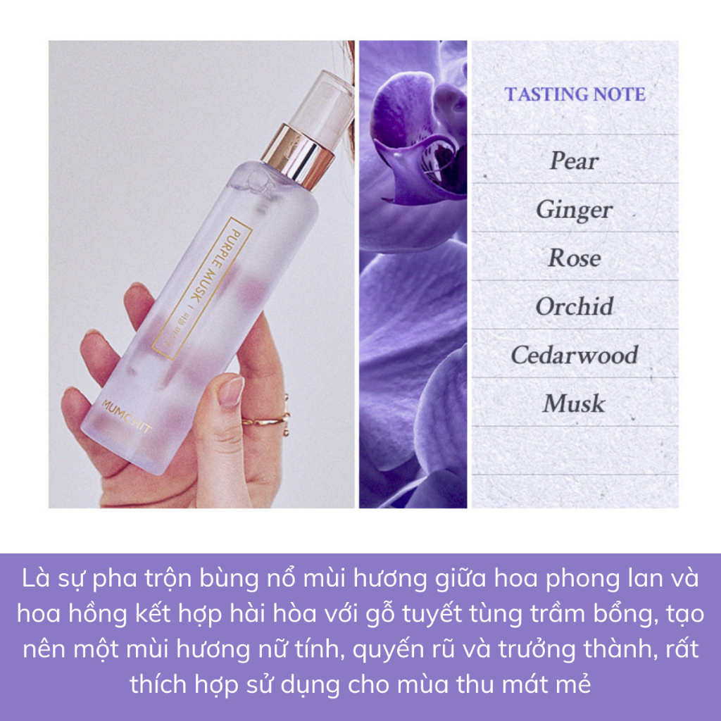 - PURPLE MUSK: Pha trộn mùi hương giữa hoa phong lan và hoa hồng kết hợp hài hòa với gỗ tuyết tùng trầm bổng, tạo nên một mùi hương nữ tính, quyến rũ và trưởng thành.