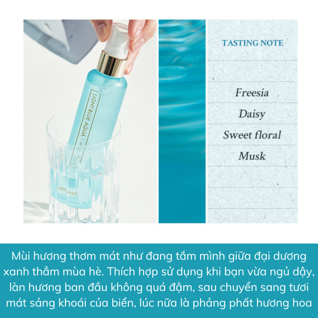 - LIGHT BLUE AQUA: Sự pha trộn hài hòa giữa lan Nam phi và hương hoa cúc tinh khiết. Mùi hương thơm mát như đang tắm mình giữa đại dương xanh thẳm giữa mùa hè.
