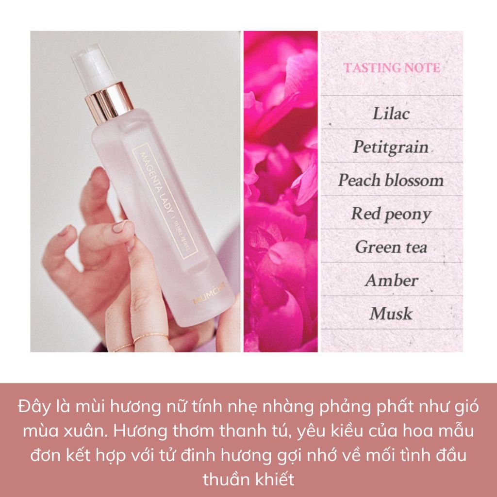 - MAGENTA LADY: Mùi hương nữ tính nhẹ nhàng phảng phất như gió mùa xuân. Hương thơm yêu kiều của hoa mẫu đơn kết hợp với tử đinh hương gợi nhớ về mối tình đầu thuần khiết.