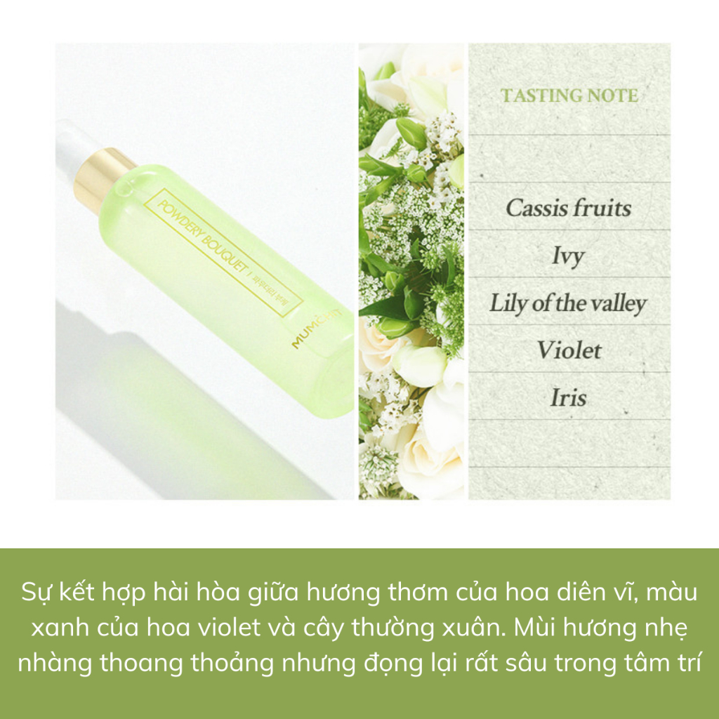 - POWDERY BOUQUET: Hương thơm của hoa diên vĩ và màu xanh của hoa violet và cây thường xuân. Mùi hương nhẹ nhàng thoang thoảng nhưng đọng lại rất sâu trong tâm trí.