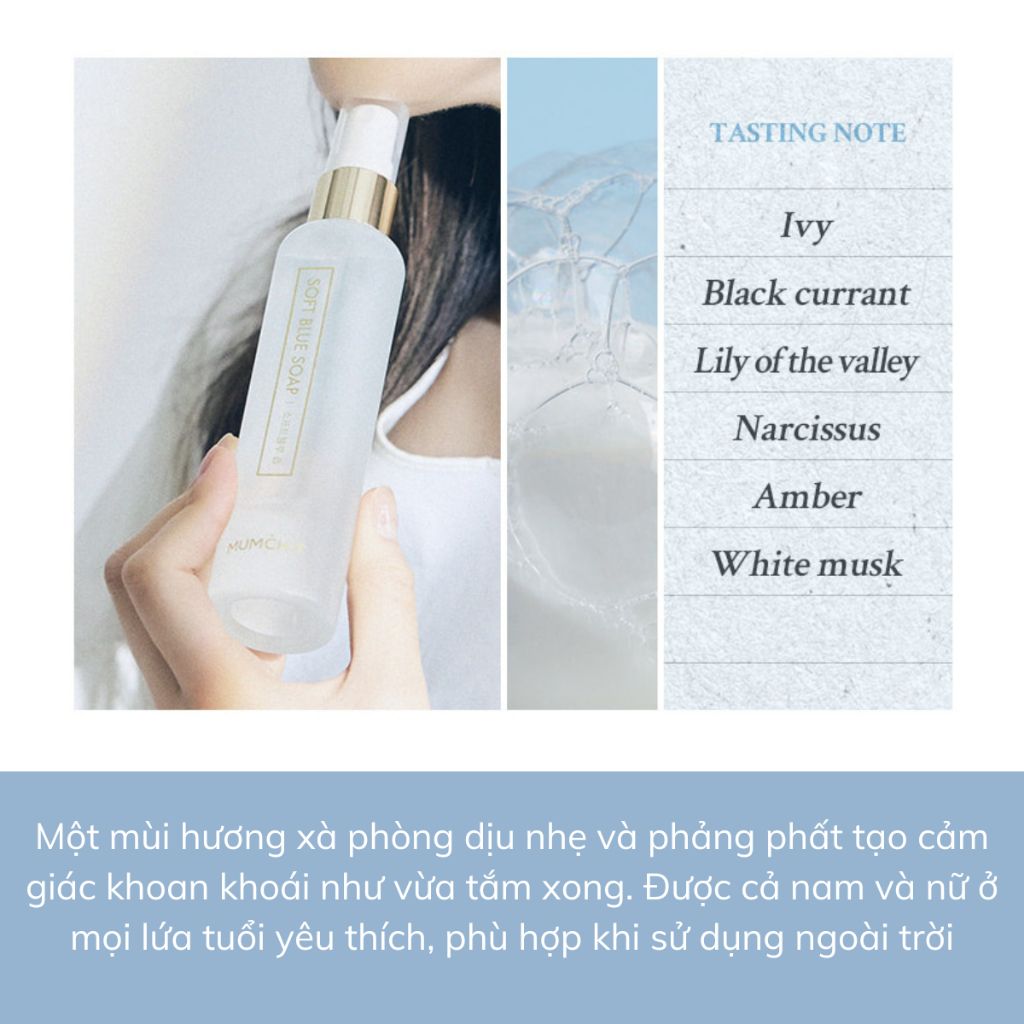 - SOFT BLUE SOAP: Mùi hương xà phòng dịu nhẹ và phảng phất tạo cảm giác khoan khoái như vừa tắm xong.