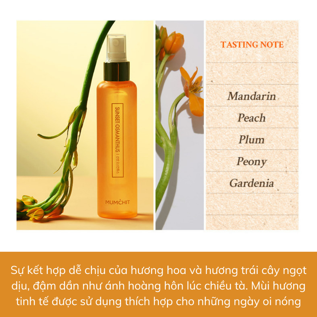 - SUNSET OSMANTHUS: Sự kết hợp dễ chịu của hương hoa và hương trái cây ngọt dịu, đậm dần như ánh hoàng hôn lúc chiều tà.