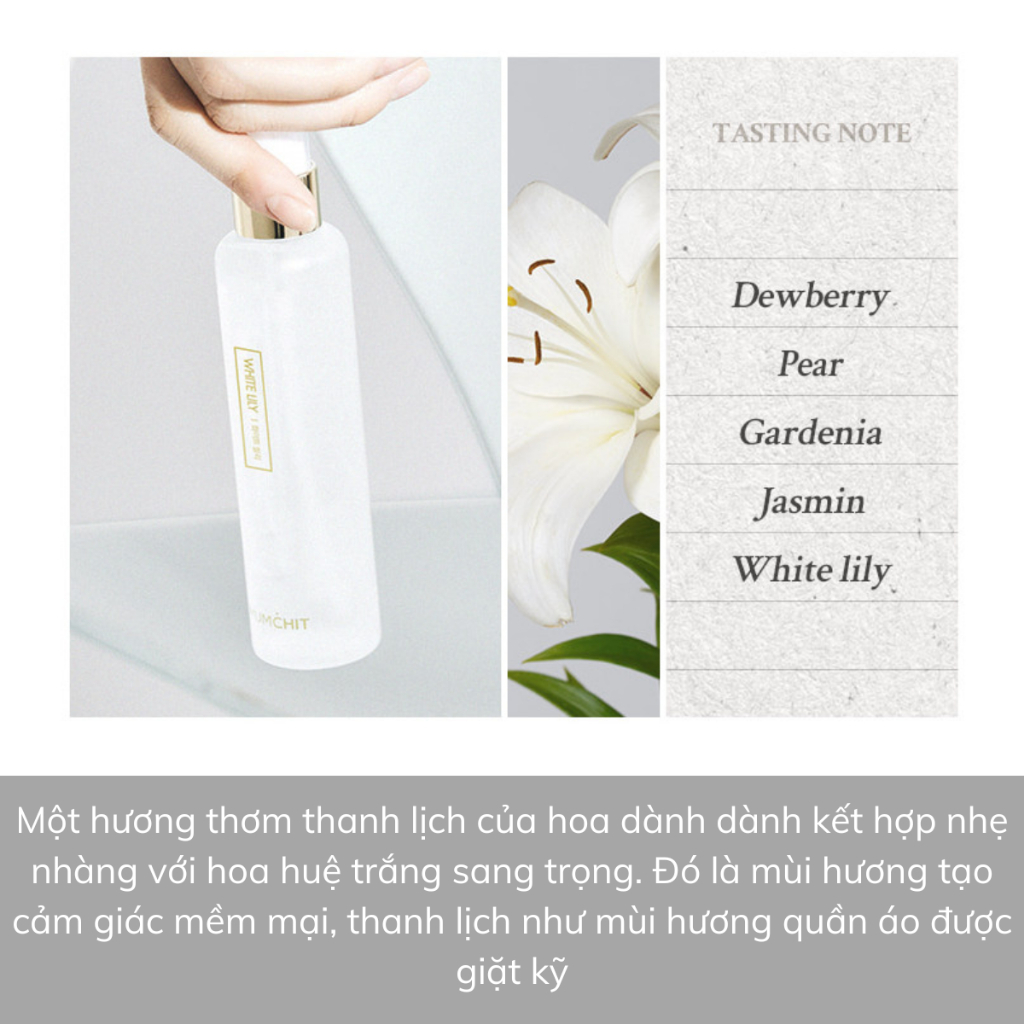 - WHITE LILY: Hương thơm thanh lịch của hoa dành dành kết hợp nhẹ nhàng với hoa huệ trắng sang trọng. Đó là mùi hương tạo cảm giác mềm mại, thanh lịch như mùi hương quần áo mới được giặt kỹ.